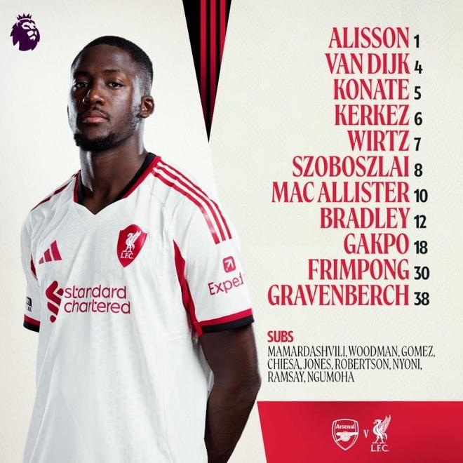 利物浦首发:1-阿利松、6-凯尔凯兹、4-范戴克、5-科纳特、12-康纳-布拉德利、38-赫拉芬贝赫、10-麦卡利斯特、8-索博斯洛伊、7-维尔茨、30-弗林蓬、18-加克波